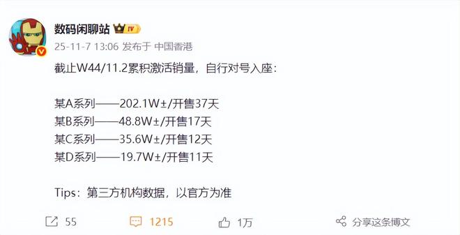 最新的數據顯示截止11月2日小米17系列的累計激活量已經超過200萬臺,大約為202.1萬臺左右。雖然我們不知道B/C/D代表的各自是哪個品牌,但從銷量上來看小米17系列絕對可以用“一騎絕塵”來形容的。有人說小米17系列占了先發的先機,其實大家可以算一下,在十一期間小米17系列的銷量是100萬臺左右,拋開這100萬臺,過了十一黃金銷量期,當友商同檔次的旗艦全部商用時,小米17系列面對如此競爭依然賣了100萬臺以上。友商的產品目前銷量最多的還不到50萬臺,這還有人講是先機的問題嗎?