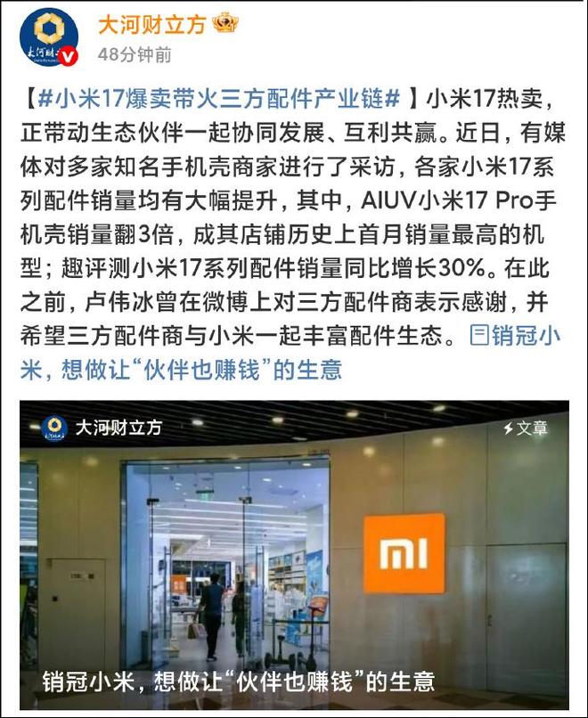 其實小米17系列熱賣的背后,不僅僅在于小米高端領域占比越來越大,甚至是6000元以上目前國內排名第一,更在于小米17系列熱銷帶動了整體供應鏈以及下游第三方產業鏈。上周就有多家媒體報道,小米17系列的熱銷讓很多第三方配件商點名感謝小米,盧偉冰還親自回應了。他表示感謝各位優勢的第三方配件商,讓我們一起攜手為用戶提供更出色的體驗。現實確實是這樣很多知名的配件商已經被小米17系列帶飛了,甚至有些還供不應求。