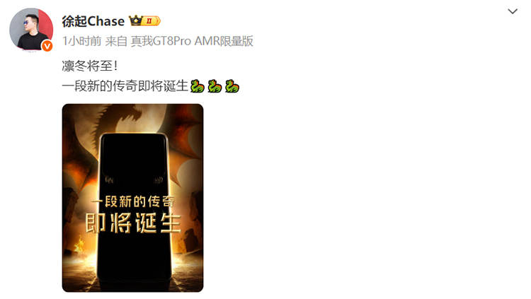 12月1日消息,今天,真我realme副總裁、全球營銷總裁、中國區總裁徐起在微博曝光了一款realme新機,同時配文“凜冬將至!一段新的傳奇即將誕生。”